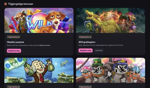 Utover velkomsttilbudene kjÞrer vi reload-tilbud og ukentlig cashback for spilleautomater, samt planlagte turneringer. Cashback er basert pÄ VIP-rang og kan komme opp i 15,5% av tap pÄ spilleautomater, kreditert ukentlig. MÄnedlige turneringer kjÞres med premiepotter opptil 115 000 NOK, og du kan bli med direkte fra turneringssiden nÄr det er tilgjengelig i regionen din.