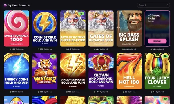 Biblioteket vÄrt dekker hovedkategoriene de fleste forventer: spilleautomater, bordspill, live casino, jackpotspill, crash-spill og klassikere som baccarat, blackjack og roulette. Du finner ogsÄ video poker, bingo, keno og mer uformelle formater. PÄ tvers av hele lobbyen er gjennomsnittlig RTP rundt 95,72%, mens enkeltspill kan variere, og noen kan ligge nÊrmere 90% avhengig av spillet.